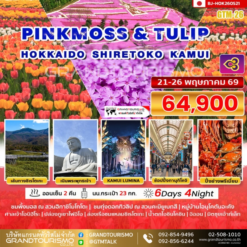 ทัวร์ญี่ปุ่น ฮอกไกโด ศาลเจ้าโอบิฮิโระ หมู่บ้านไอนุโคตันอะคัง ปล่องภูเขาไฟอิโอ ล่องเรือชมแหลมชิเรโตเกะ น้ำตกโอชินโคชิน พิ้งมอส ทุ่งดอกทิวลิป อิออน ร้านนันดะ 6 วัน 4 คืน 21-26 พ.ค. 69