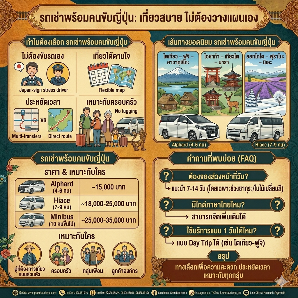 รถเช่าพร้อมคนขับญี่ปุ่น เป็นบริการยอดนิยมสำหรับนักท่องเที่ยวที่ต้องการเที่ยวแบบส่วนตัว (Private Tour) โดยไม่ต้องขับรถเอง ไม่ต้องวางแผนเส้นทาง และไม่ต้องกังวลเรื่องภาษา เหมาะสำหรับทั้งครอบครัว กลุ่มเพื่อน และลูกค้าองค์กร
