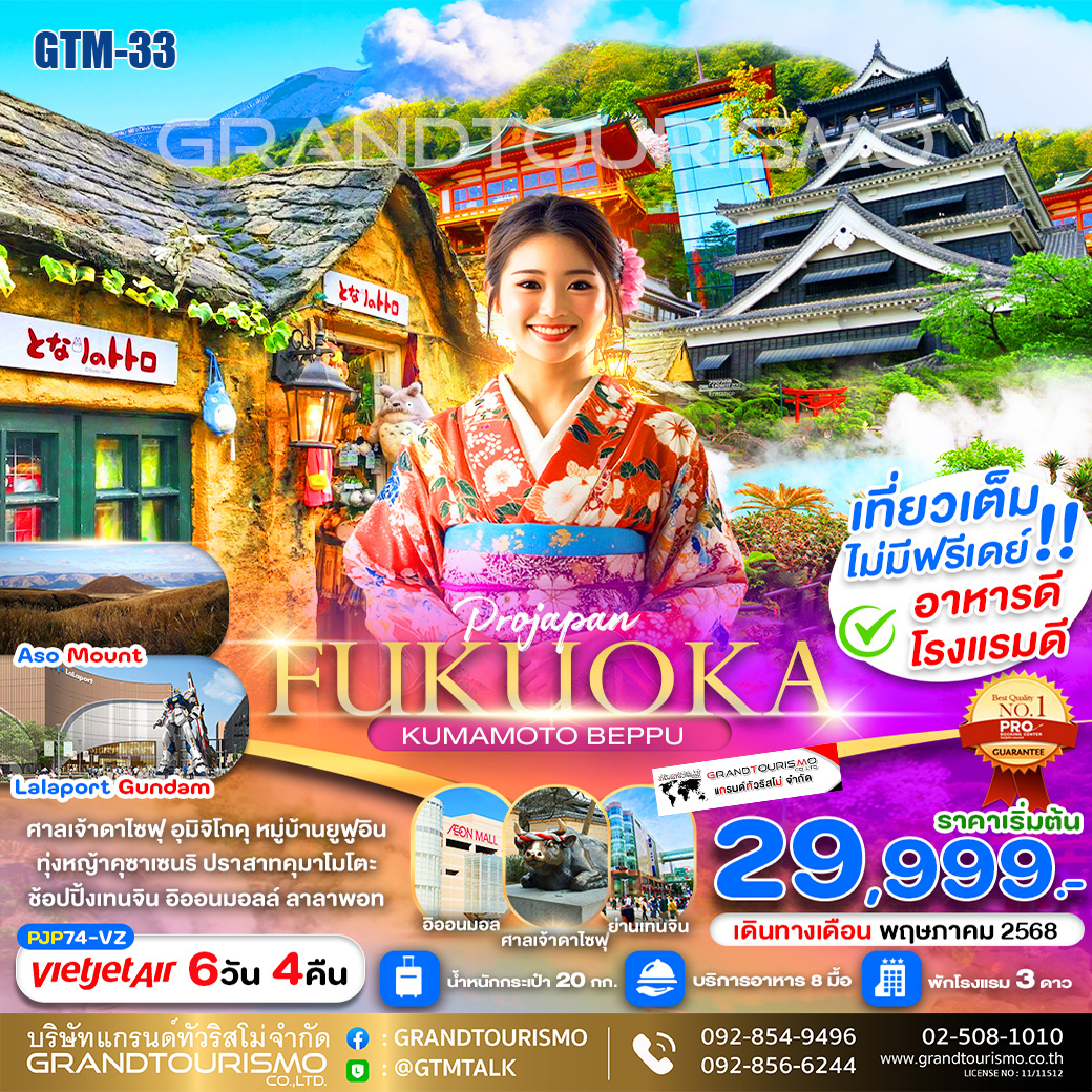 ทัวร์ญี่ปุ่น ฟุกุโอกะ คุมาโมโตะ เบบปุ 6วัน4คืน มิ.ย.-ต.ค.68