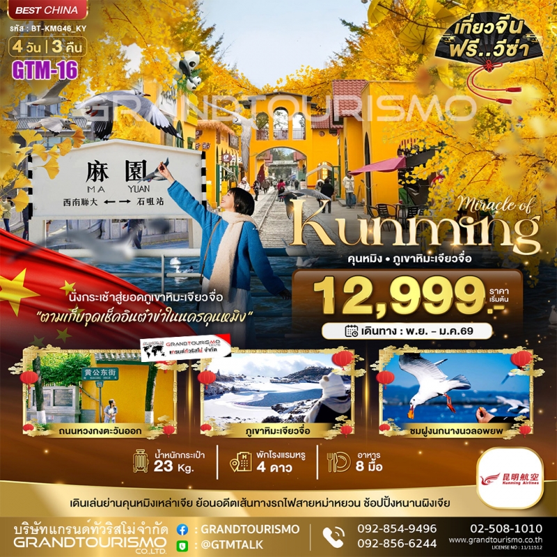 ทัวร์จีน คุนหมิง ภูเขาหิมะเจียวจื่อ เขาซีซาน เขี่อนไห่เกิง ทะเลสาบชุ่ยหู ถนนต้นแปะก๊วยเหวินหลิน 4วัน3คืน พ.ย.68-ม.ค.69