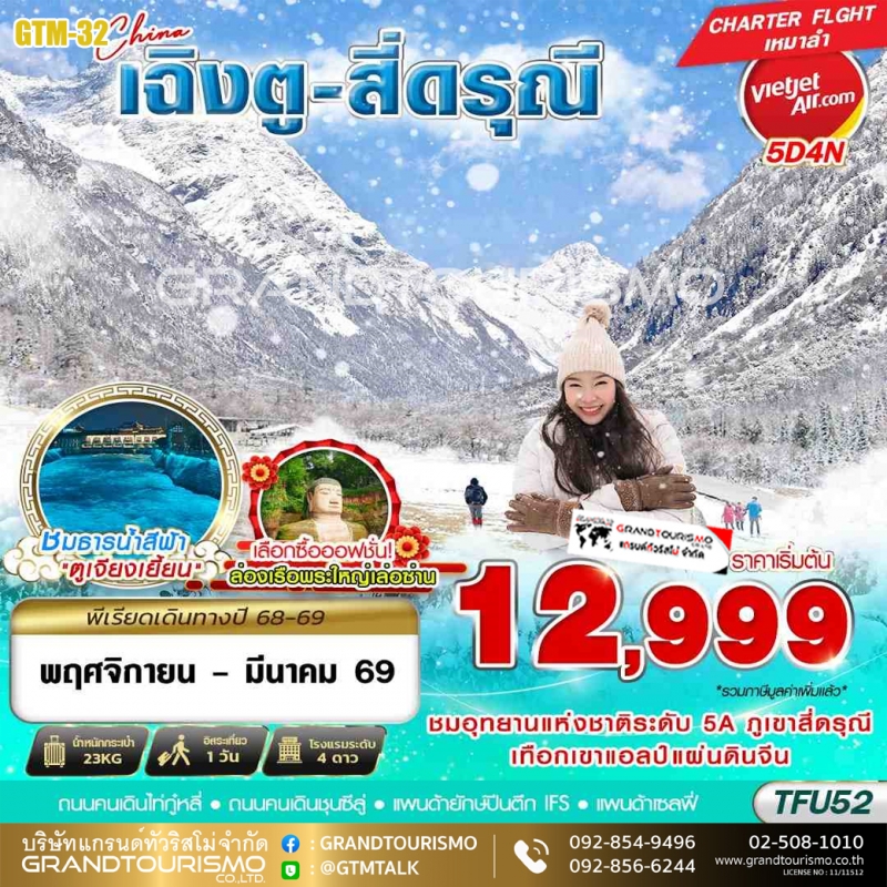 ทัวร์จีน เฉิงตู ภูเขาหิมะวาวู่ ขึ้นกระเช้าชมภูเขาโต๊ะ ตูเจียงเยี่ยน จตุรัสหย่างเทียนวู่ แพนด้าเซลฟี่ น้ำพุไม้ไผ่ วัดต้าฉือ ถนนคนเดินชุนชีลู่ 4 วัน 3 คืน มีนาคม 69