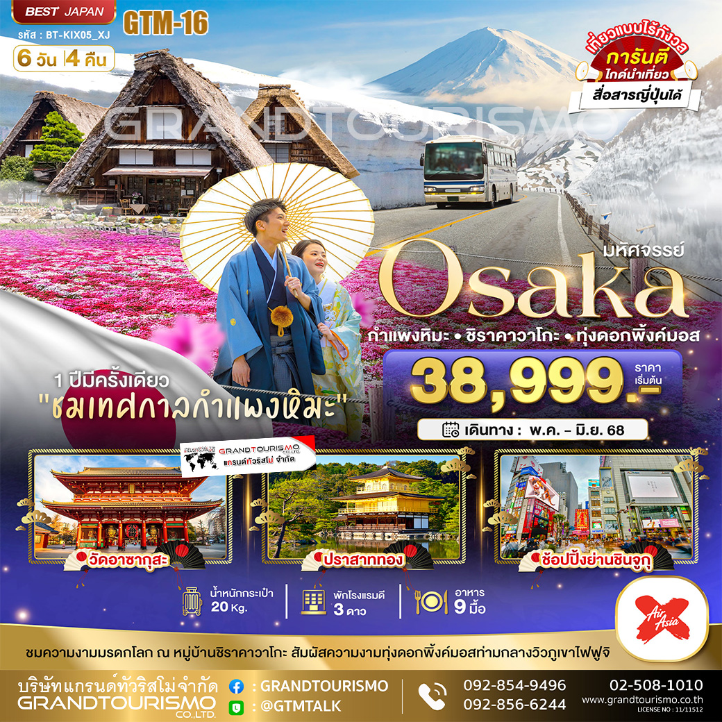 ทัวร์ญี่ปุ่น โอซาก้า โตเกียว เกียวโต กำแพงหิมะ ชิราคาวาโกะ ทุ่งดอกพิ้งค์มอส 6วัน4คืน พ.ค.-มิ.ย.68