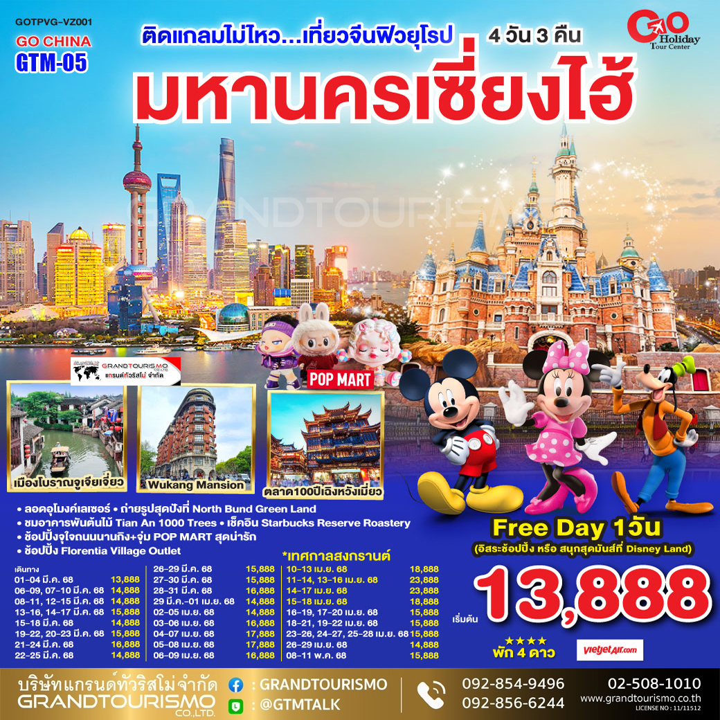 ทัวร์จีน เซี่ยงไฮ้ อิสระ1 วัน หาดไว่ทาน อาคารพันต้นไม้ ถนนนานกิง เมืองโบราณจูเจียเจี่ยว POP MART 4 วัน 3 คืน มิ.ย. 68 BY VZ