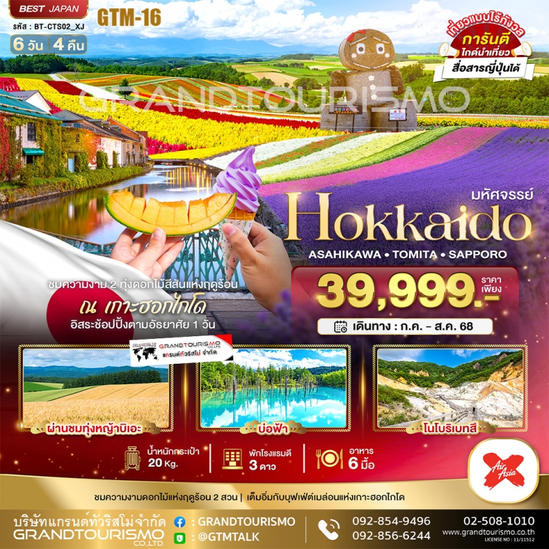 ทัวร์ญี่ปุ่น ฮอกไกโด อาซาฮิกาว่า โทมิตะฟาร์ม ซัปโปโร โนโบริเบทสึ โอตารุ บิเอะ 6วัน4คืน ก.ค.-ส.ค.68