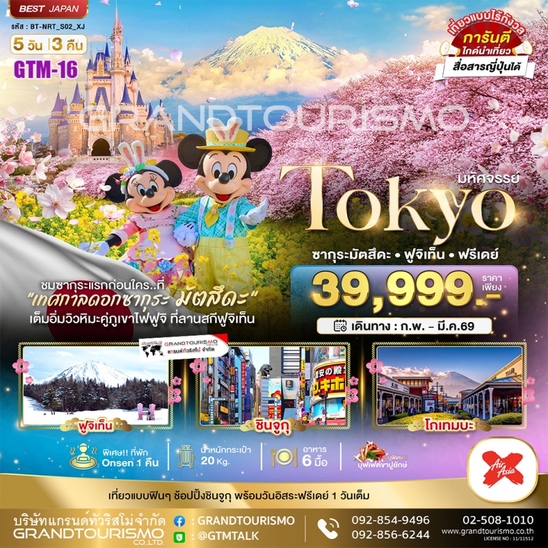 ทัวร์ญี่ปุ่น โตเกียว คานากาว่า ซากุระมัตสึดะ ลานสกีฟูจิเทน คาวากูจิโกะ (อิสระ1วัน) 5วัน3คืน ธ.ค.68-มี.ค.69