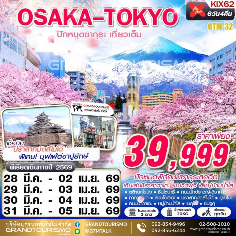 ทัวร์ญี่ปุ่น โอซาก้า โตเกียว โทยามะ เกียวโต มัตสึโมโต้ ฟูจิ 6วัน4คืน มี.ค.-เม.ย.69