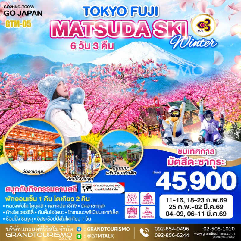 ทัวร์ญี่ปุ่น โตเกียว ฟูจิ อิสระ 1 วัน คามาคุระ หลวงพ่อโตไดบุตสึ คาวากุจิโกะ มัตสึดะซากุระ แช่ออนเซน บุฟเฟ่ต์ขาปูยักษ์ เล่นสกี ตลาดปลาซึกิจิ ไดเวอร์ซิตี้ 6 วัน 3 คืน ก.พ.-มี.ค. 69