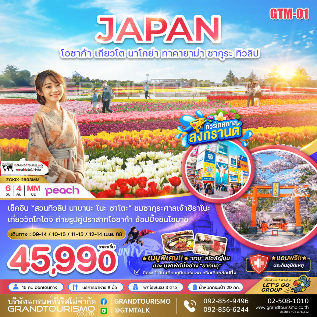 ทัวร์ญี่ปุ่น โอซาก้า เกียวโต นาโกย่า ทาคายาม่า ซากุระ ทิวลิป (อิสระ1วัน) 6วัน4คืน เม.ย.68