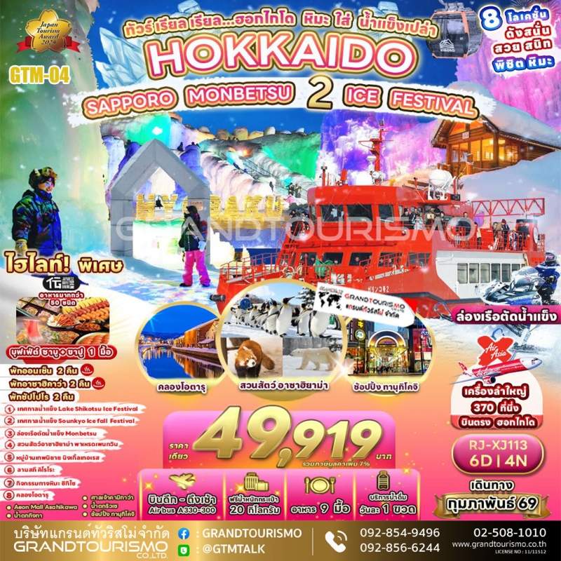 ทัวร์ญี่ปุ่น ฮอกไกโด ล่องเรือตัดน้ำแข็ง ซัปโปโร ทะเลสาบชิโคสึ น้ำตกกิงกะ น้ำตกริวเซ โซอุนเคียว สวนสัตว์อาซาฮิยาม่า นิงเกิ้ลเทอเรส 6 วัน 4 คืน ก.พ. 69