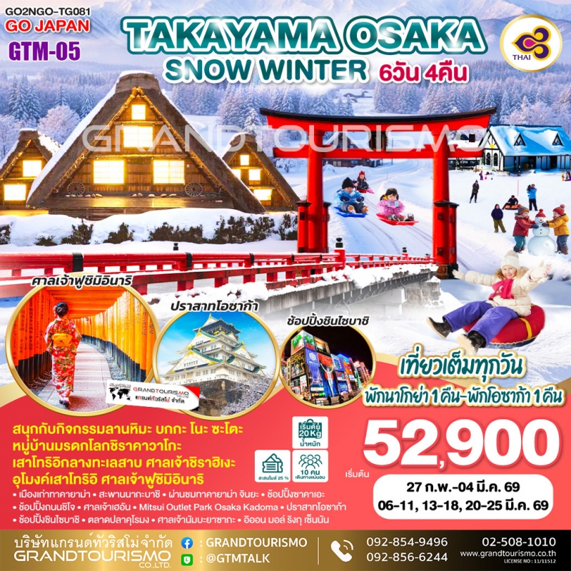 ทัวร์ญี่ปุ่น นาโกย่า โอซาก้า กิฟุ ทาคายาม่า เกียวโต ชิราคาวาโกะ ศาลเจ้าฟูชิมิอินาริ ทะเลสาบบิวะ 6วัน4คืน ก.พ.-มี.ค.69