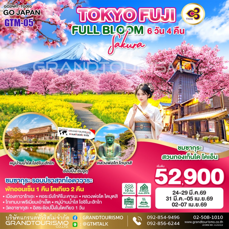 ทัวร์ญี่ปุ่น โตเกียว คาวาโกเอะ คามาคุระ คาวากุจิโกะ หมู่บ้านน้ำใส ชมซากุระ (อิสระ1วัน) 6วัน4คืน มี.ค.-เม.ย.69