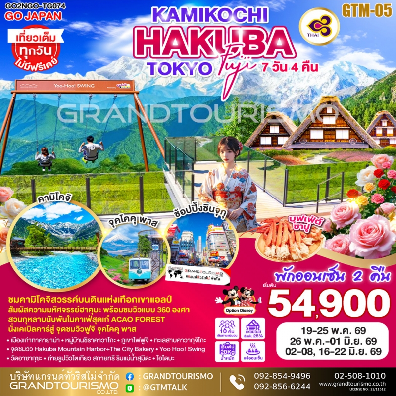 ทัวร์ญี่ปุ่น โตเกียว (option ดิสนีย์แลนด์) นาโกย่า ชิราคาวาโกะ นากาโน่ คามิโคจิ ฮาคุบะ ภูเขาไฟฟูจิ คาวากุจิโกะ บุฟเฟ่ต์ขาปู 6วัน4คืน พ.ค.-มิ.ย.69 BY TG