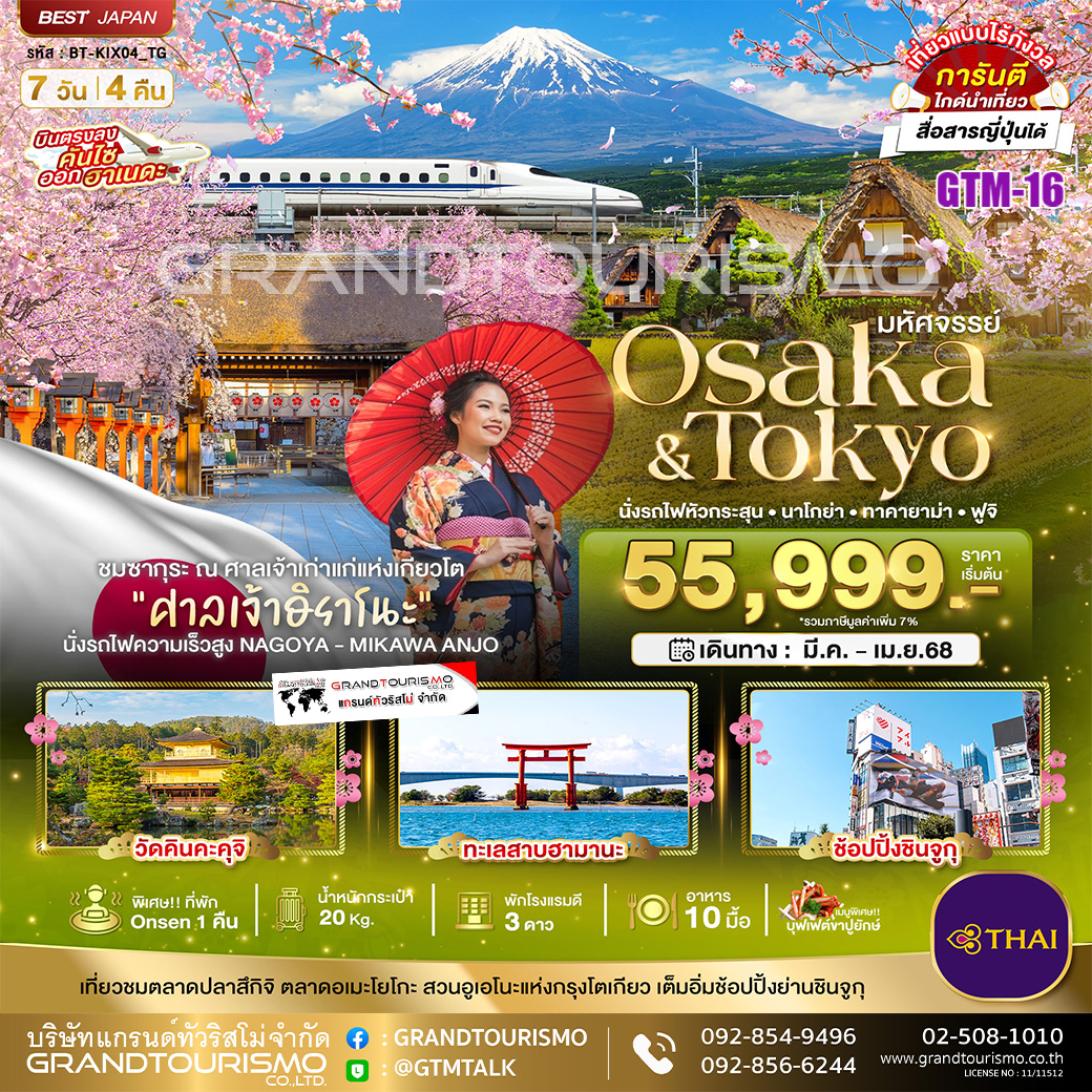 ทัวร์ญี่ปุ่น โอซาก้า โตเกียว นั่งรถไฟหัวกระสุน นาโกย่า ทาคายาม่า ฟูจิ 7วัน4คืน มี.ค.-เม.ย.68