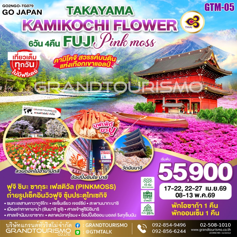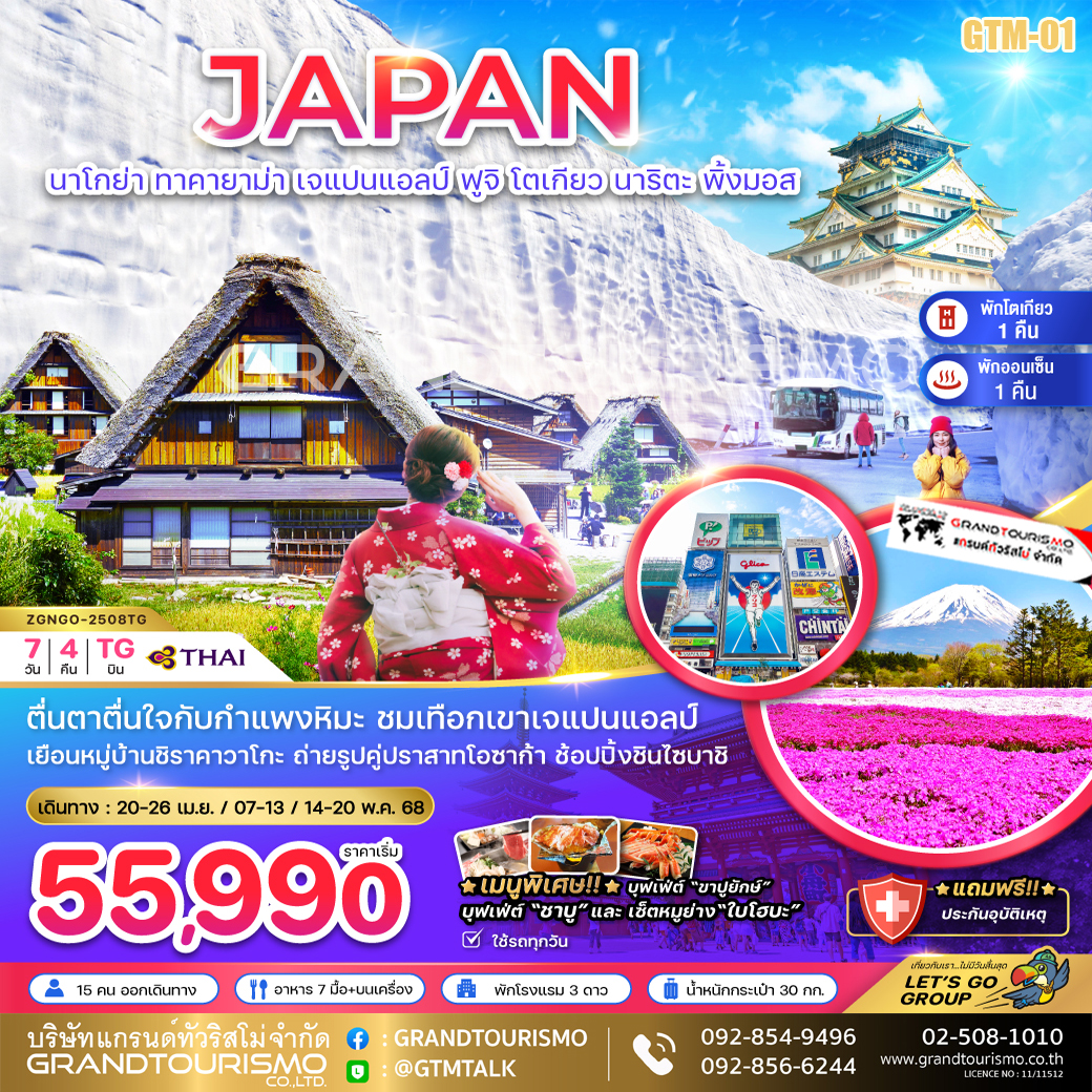 ทัวร์ญี่ปุ่น นาโกย่า ทาคายาม่า ชิราคาวาโกะ เจแปนแอลป์ ฟูจิ โตเกียว นาริตะ พิงค์มอส 7 วัน 4 คืน เม.ย.-พ.ค. 68