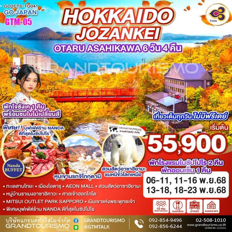 ทัวร์ญี่ปุ่น ฮอกไกโด ซัปโปโร โนโบริเบทสึ โจซังเค โอตารุ อาซาฮิคาวะ 6วัน4คืน พ.ย.68