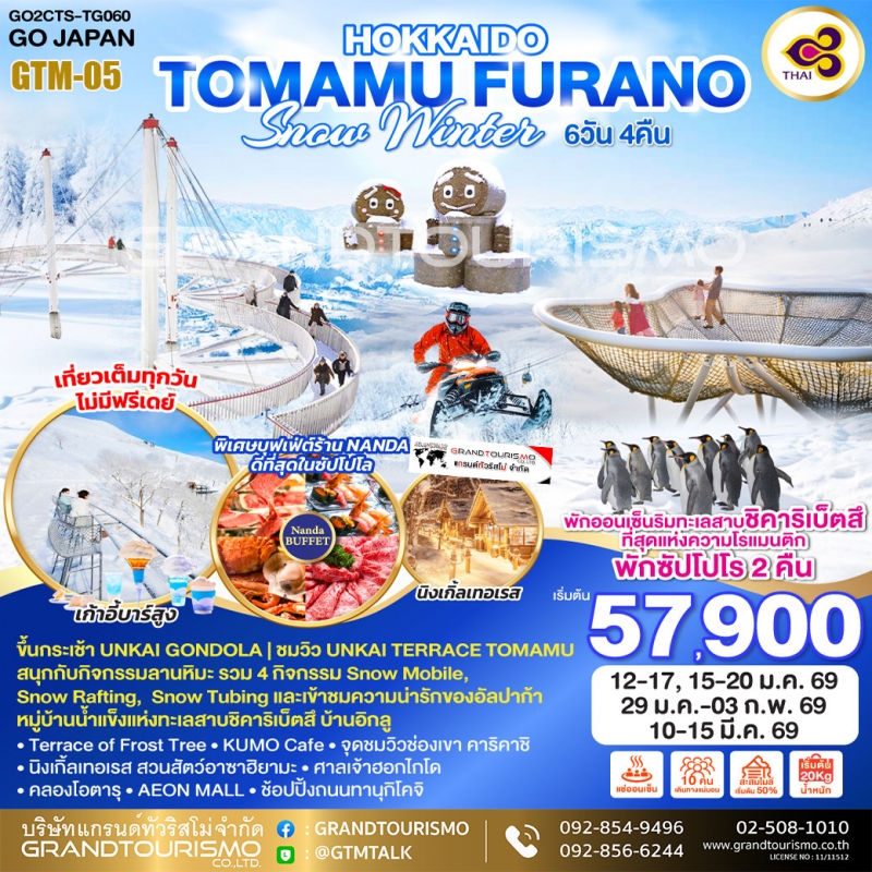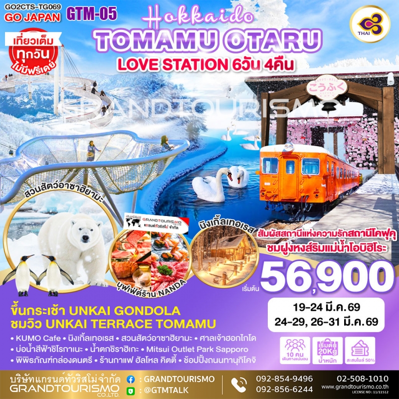 ทัวร์ญี่ปุ่น ฮอกไกโด ซัปโปโร โอบิฮิโระ โทมามุ อาซาฮิคาวะ สวนสัตว์อาซาฮิยามะ บิเอะ โอตารุ นิงเกิ้ลเทอเรส 6วัน4คืน มี.ค.69 BY TG