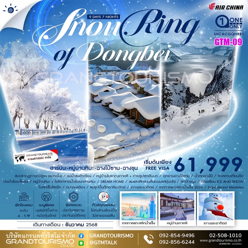 ทัวร์จีน ฮาร์บิน จี๋หลิน ฉางชุน ฉางไป๋ซาน หมู่บ้านหิมะ เกาะพระอาทิตย์ (ไม่ลงร้าน)(ต่อเครื่อง) 9วัน7คืน ธ.ค.68-ม.ค.69