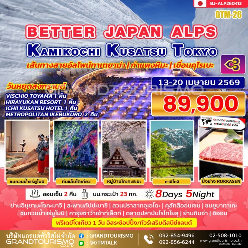 ทัวร์ญี่ปุ่น โตเกียว นาโกย่า อิสระ 1 วัน ปราสาทอินุยาม่า หมู่บ้านมรดกโลกโกะคะยะมะ ทาเทยาม่า Japan alps กำแพงหิมะ แช่น้ำแร่ คามิโคจิ ทีมแลบ ปิ้งย่างพรีเมียมROKKASEN 7 วัน 5 คืน 13-20 เม.ย. 69