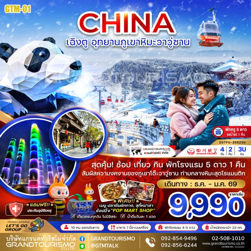 ทัวร์จีน เฉิงตู อุทยานภูเขาหิมะวาวู่ซาน แช่น้ำแร่ น้ำพุไม้ไผ่ ตึกแฝดเฉิงตู แพนด้ายักษ์ปีนตึก 4 วัน 2 คืน พ.ย. 68 - ม.ค. 69