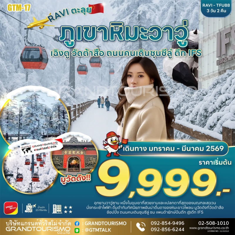 ทัวร์จีน เฉิงตู ภูเขาหิมะวาวู่ รวมนั่งกระเช้าไป-กลับ วัดต้าสือ ถนนคนเดินชุนซีลู่ แพนด้ายักษ์ปีกตึก IFS 3 วัน 2 คืน ม.ค. - มี.ค. 69