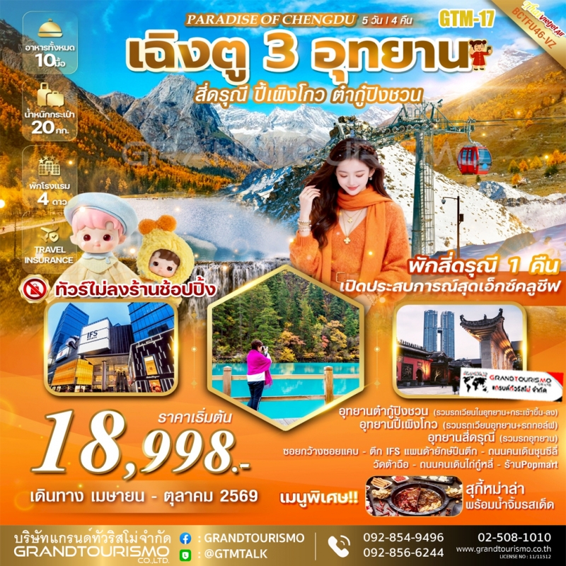 ทัวร์จีน เฉิงตู ไม่ลงร้าน สี่ดรุณี ภูเขาหิมะวาวู่ ง้อไบ๊ ตูเจียงเอี้ยน หมีแพนด้าเซลฟี่ หอหนังสือจงซูเก๋อ ถนนคนเดินซุนซีลู่ แพนด้ายักษ์ปีนตึก 5 วัน 4 คืน มี.ค. 69