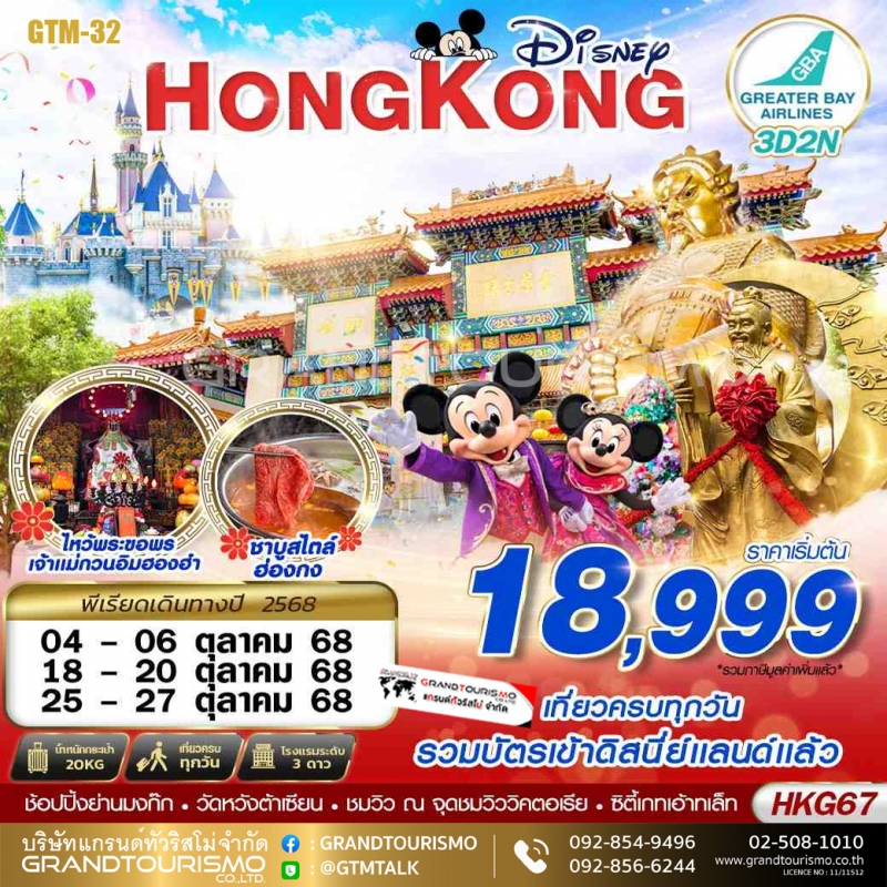 ทัวร์ฮ่องกง ดิสนีย์แลนด์ หวังต้าเซียน รีพัลส์เบย์ มงก๊ก เจ้าพ่อกวนอูไท เจ้าแม่กวนอิมฮองฮำ 3 วัน 2 คืน ต.ค. 68