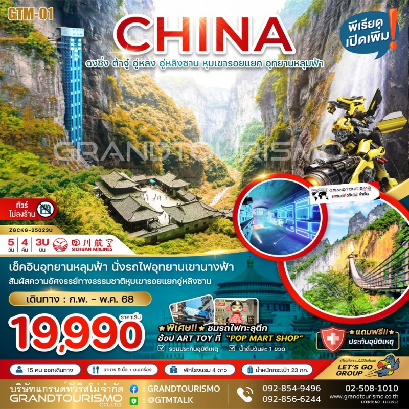 ทัวร์จีน ฉงชิ่ง อู่หลง ฝูหรงเจิ้น จางเจียเจี้ย อี้ชาง (นั่งรถไฟความเร็วสูง) 7วัน6คืน ก.ย.-ต.ค.68