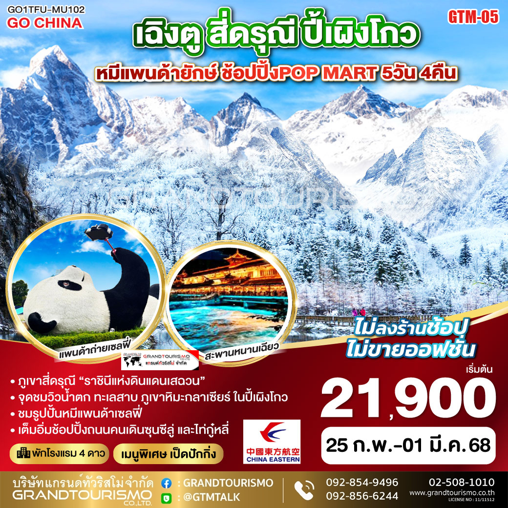 ทัวร์จีน เฉิงตู ไม่ลงร้าน สี่ดรุณี อุทยานปี้ผิงโกว เมืองตูเจียงเอี้ยน อุทยานภูผาหิมะการ์เซียสวรรค์ ต๋ากู่ปิงชวน วัดต้าฉือ ถนนไท่กู่หลี่ แพนด้ายักษ์ปีนตึก 5 วัน 4 คืน มี.ค. 69