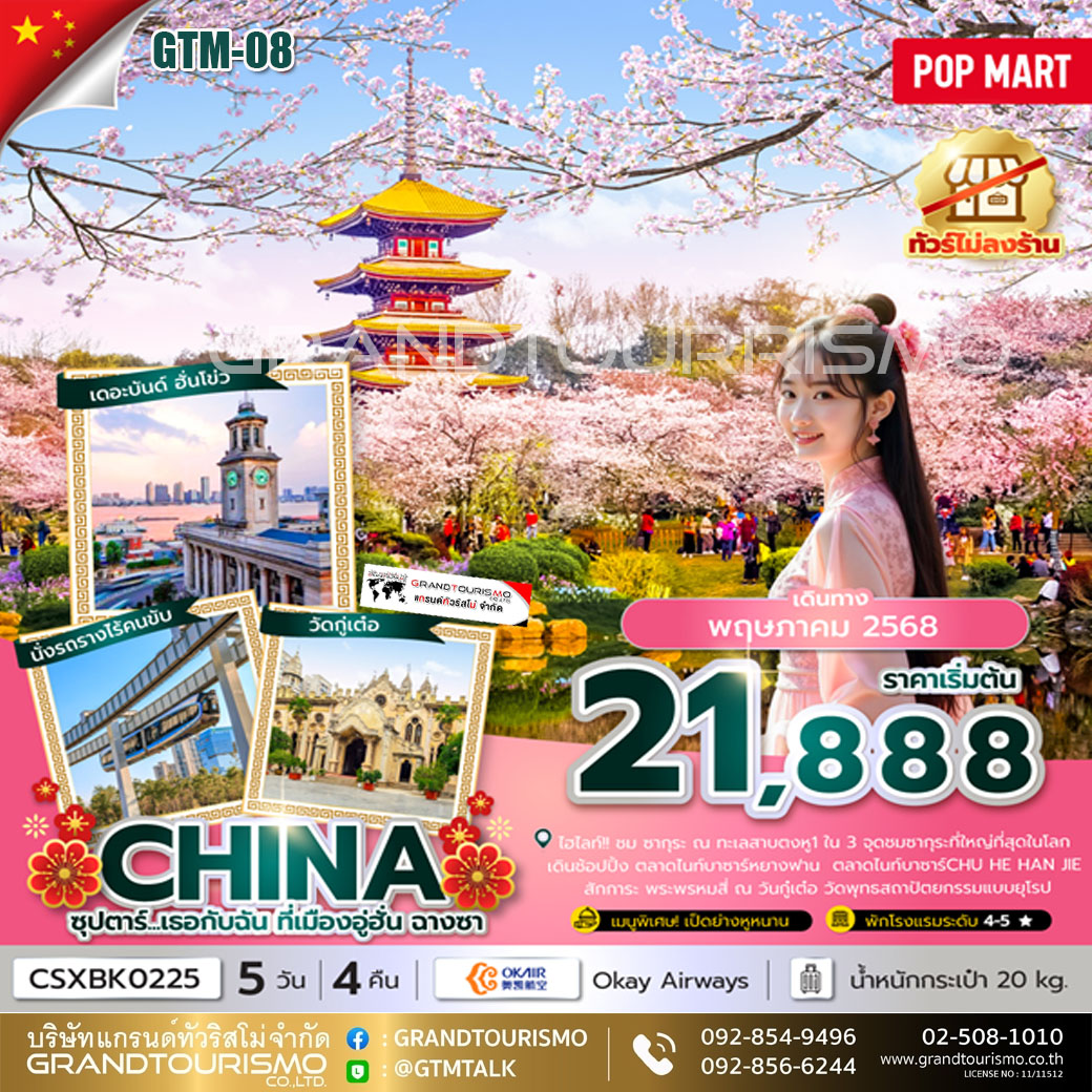 ทัวร์จีน ฉางซา อู่ฮั่น ซื่อปี้ ชมซากุระ POPMART (ทัวร์ฉางซาไม่ลงร้าน) 5วัน4คืน พ.ค.68