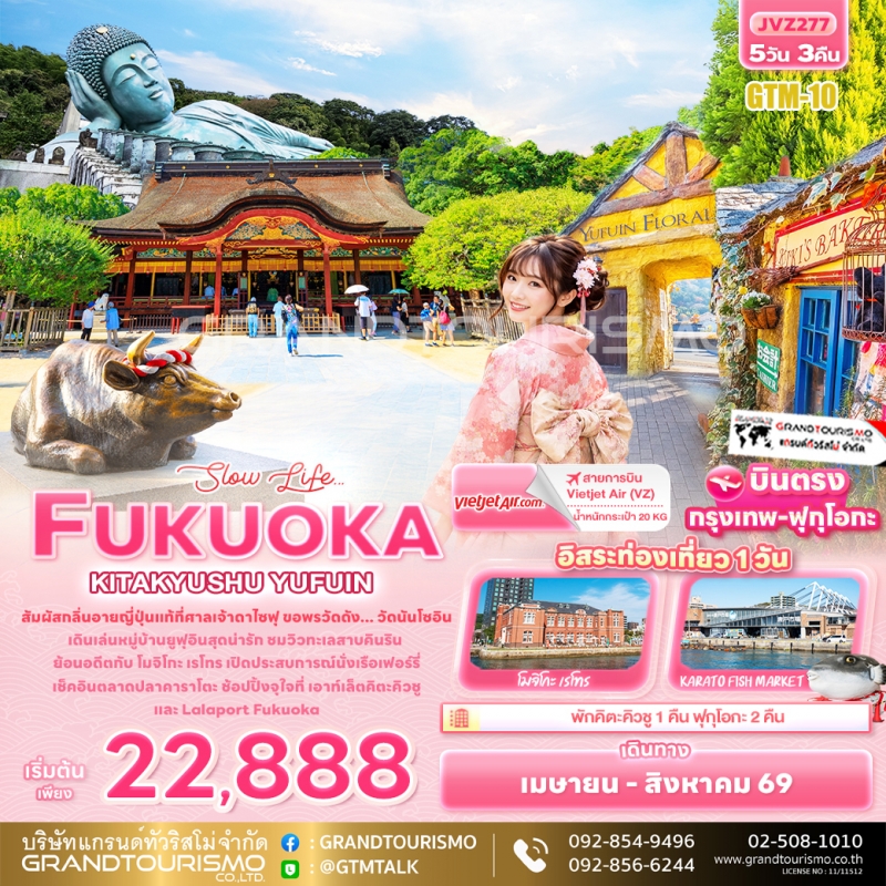 ทัวร์ญี่ปุ่น ฟุกุโอกะ อิสระ 1 วัน ศาลเจ้าดาไซฟุเท็มมังกุ หมู่บ้านยูฟูอิน เมืองคิตะคิวชู ท่าเรือคาราโตะ ตลาดปลาคาราโตะ วัดนันโซอิน 5 วัน 3 คืน เม.ย. - ส.ค. 69
