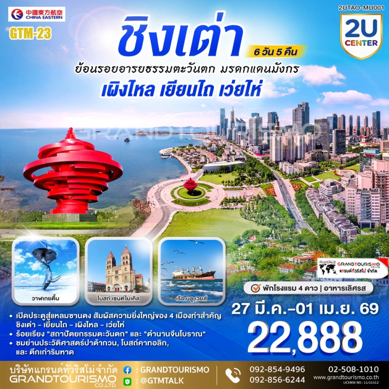 ทัวร์จีน ชิงเต่า ไม่ลงร้านช้อป เยียนไถ เว่ยไห่ ท่าเรือชาวประมงซาจื่อโข่ว สะพานจ้านเฉียว เรือบูลเวย์ส พิพิธภัณฑ์เบียร์ชิงเต่า โบสถ์ เซนต์ ไมเคิล เขาซินฮ่าวซาน 6 วัน 5 คืน 27 มี.ค. - 01 เม.ย. 69