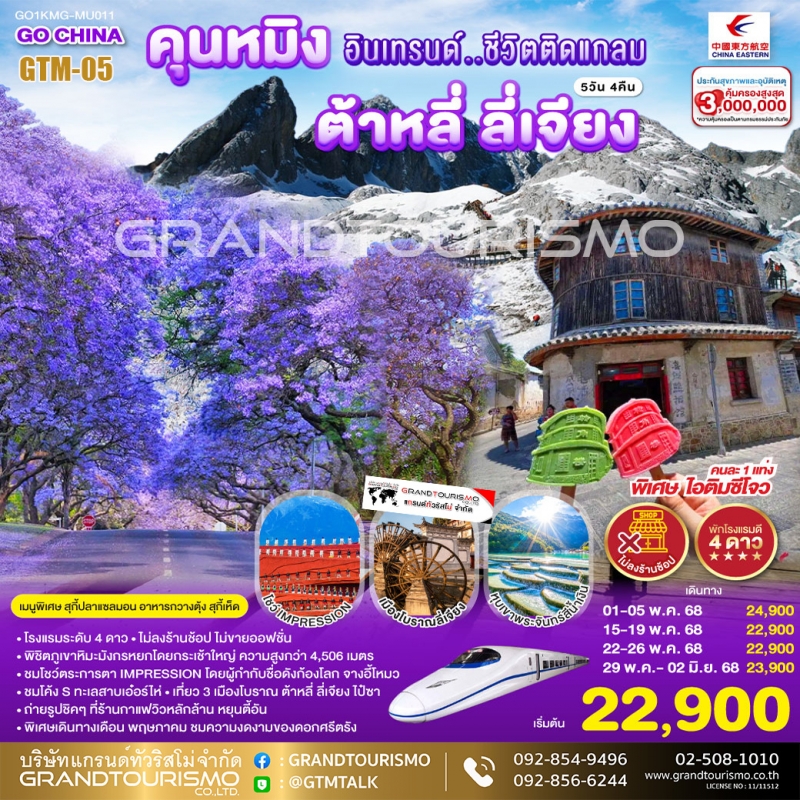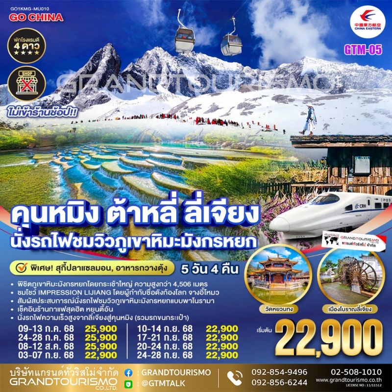ทัวร์จีน คุนหมิง ต้าหลี่ ลี่เจียง ภูเขาหิมะมังกรหยก นั่งรถไฟความเร็วสูง (ไม่ลงร้าน) ก.ค.-ก.ย.68 5วัน4คืน