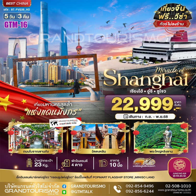 ทัวร์จีน เซี่ยงไฮ้ อู๋ซี ซูโจว พระใหญ่หลิงซาน วัดตงหลิน ลอดอุโมงค์เลเซอร์ หาดไว่ทาน (ไม่ลงร้าน) 5วัน3คืน ก.ย.-ธ.ค.68