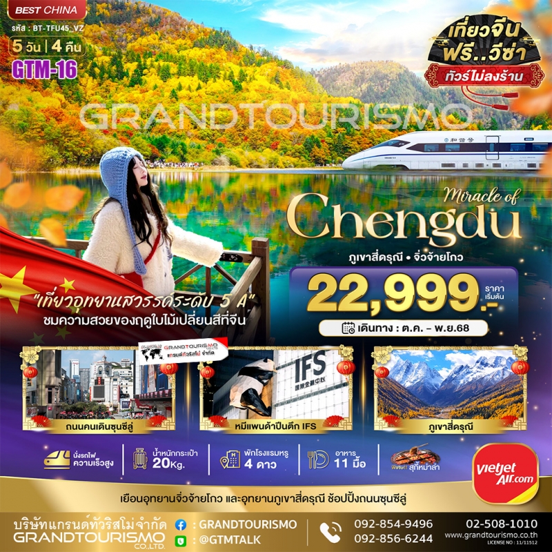 ทัวร์จีน เฉิงตู จิ่วจ้ายโกว ภูเขาสี่ดรุณี เมืองโบราณซงพาน (ไม่ลงร้าน-นั่งรถไฟความเร็วสูง) 5วัน4คืน ต.ค.-พ.ย.68