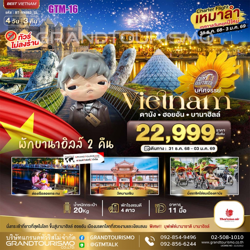 ทัวร์เวียดนามกลาง พักบาน่าฮิลล์ 2 คืน ไม่ลงร้าน สวนสนุกแฟนตาซี ดานัง ฮอยอัน วัดลินห์อึ๋ง นั่งเรือกระด้ง ล่องเรือลอยกระทง นั่งรถสามล้อซิโคล่ 4 วัน 3 คืน 12-15 เม.ย. 69