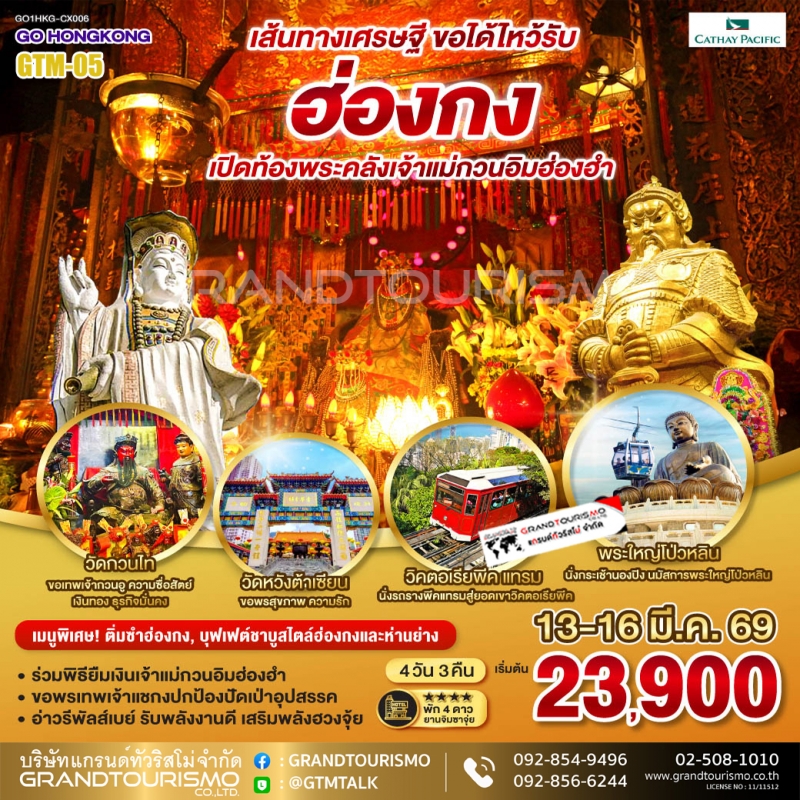 ทัวร์ฮ่องกง อิสระ 1 วัน พิธียืมเงินเจ้าแม่กวนอิมฮองฮำ วิคตอเรียพีค รีพัลส์เบย์ วัดหวังต้าเซียน วัดแชกงหมิว จิมซาจุ่ย นองปิง 4 วัน 3 คืน 13-16 มี.ค. 69