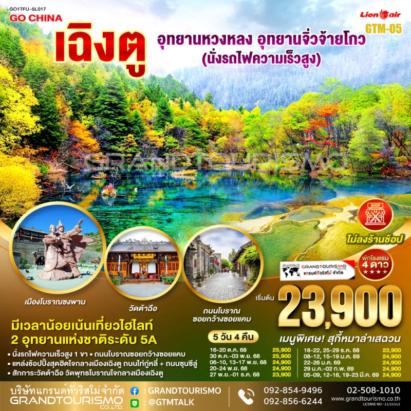 ทัวร์จีน เฉิงตู ไม่ลงร้าน หวงหลง จิ่วจ้ายโกว เมืองโบราณซงพาน รถไฟความเร็วสูง 5 วัน 4 คืน ต.ค. 68 - มี.ค. 69