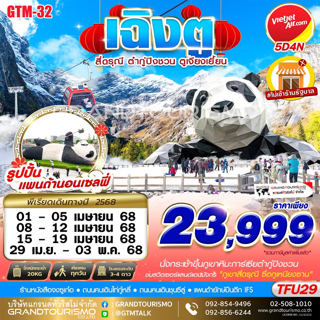 ทัวร์จีน เฉิงตู สี่ดรุณี ต๋ากู่ปิงชวน ตูเจียงเยี้ยน (ทัวร์เฉิงตูไม่ลงร้าน) 5วัน4คืน เม.ย.68