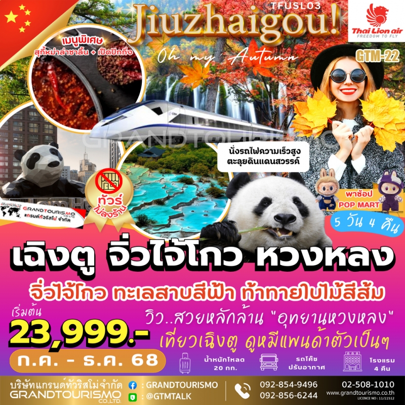 ทัวร์จีน เฉิงตู ไม่ลงร้านช้อป จิ่วไจ้โกว หวงหลง นั่งรถไฟความเร็วสูง ชมหมีแพนด้า เมืองโบราณซงพาน 5 วัน 4 คืน ก.ค.-ธ.ค. 68