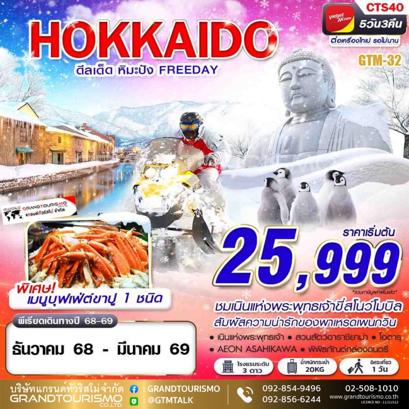 ทัวร์ญี่ปุ่น ฮอกไกโด อิสระ 1 วัน เนินแห่งพระพุทธเจ้า โอตารุ สวนสัตว์อาซาฮิยาม่า ลานสกีชิคิไซ พาโนราม่า บุฟเฟ่ต์ขาปูยักษ์ 5 วัน 3 คืน ธ.ค. 68 -มี.ค. 69