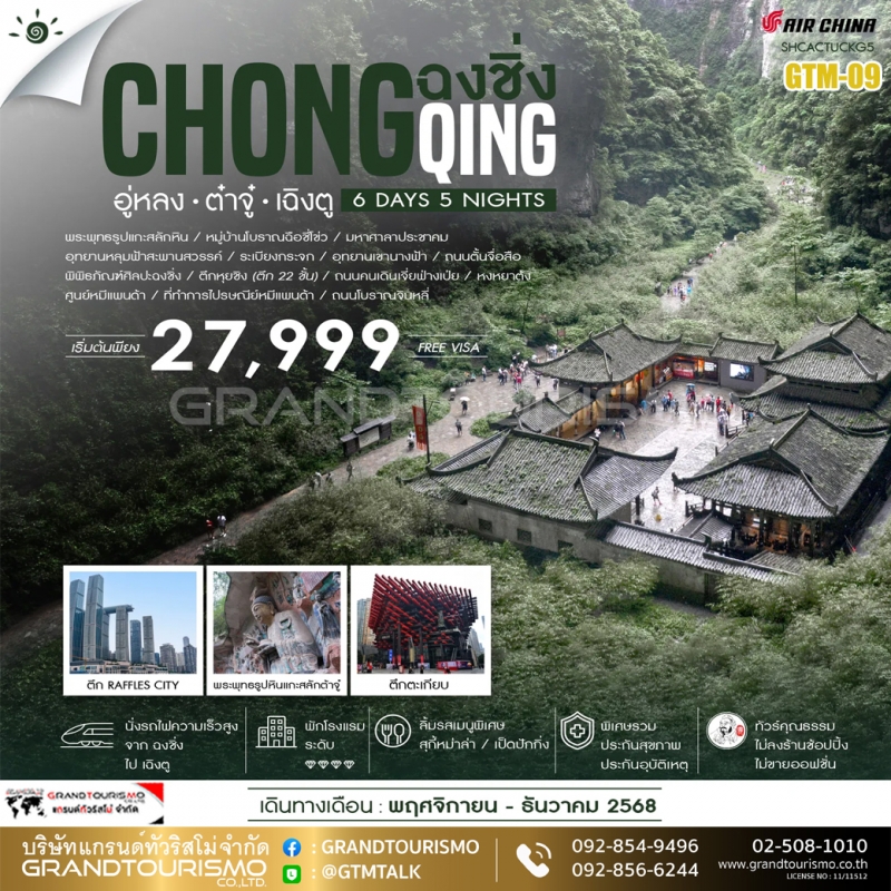 ทัวร์จีน ฉงชิ่ง ไม่ลงร้าน ต้าจู๋ อู่หลง อุทยานเขานางฟ้า รถไฟฟ้าทะลุตึก Raffles City Chongqing 5 วัน 4 คืน มิ.ย.-พ.ย. 68