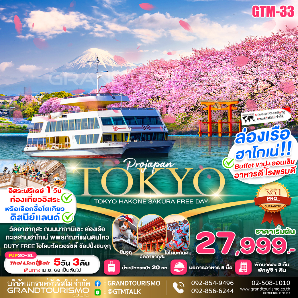 ทัวร์ญี่ปุ่น โตเกียว ฮาโกเน่ ซากุระ (แวะพักเครื่อง)(อิสระ1วัน) 5วัน3คืน เม.ย.68
