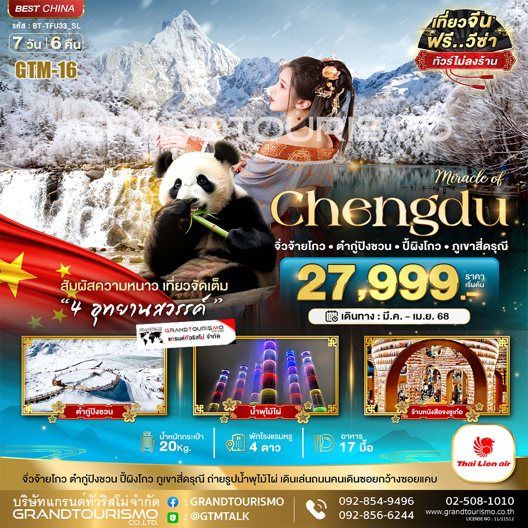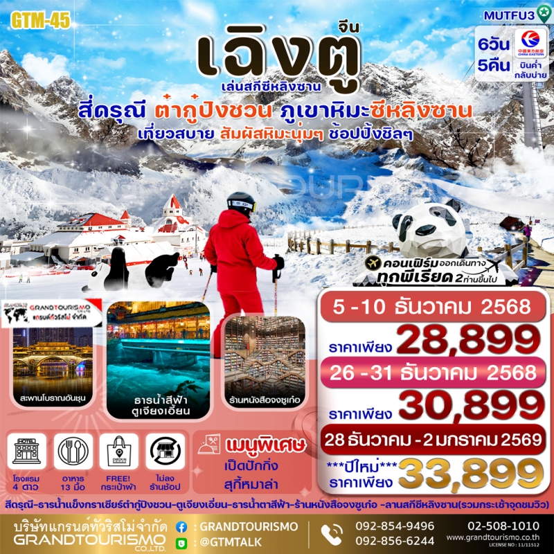 ทัวร์จีน เฉิงตู ไม่ลงร้าน สี่ดรุณี ธารน้ำแข็งต๋ากู๋ ภูเขาหิมะซีหลิง เล่นสกี ตูเจียงเยี่ยน ธารน้ำสีฟ้า ร้านหนังสือจงซูเก๋อ น้ำพุไม้ไผ่ 6 วัน 5 คืน ธ.ค. 68