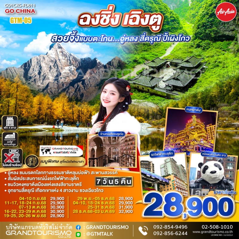 ทัวร์จีน ฉงชิ่ง เฉิงตู ไม่ลงร้าน อู่หลง อุทยานหลุมบ่อฟ้า สี่ดรุณี ปี้เผิงโกว รถไฟความเร็วสูง 7 วัน 5 คืน ก.ย.-ธ.ค. 68