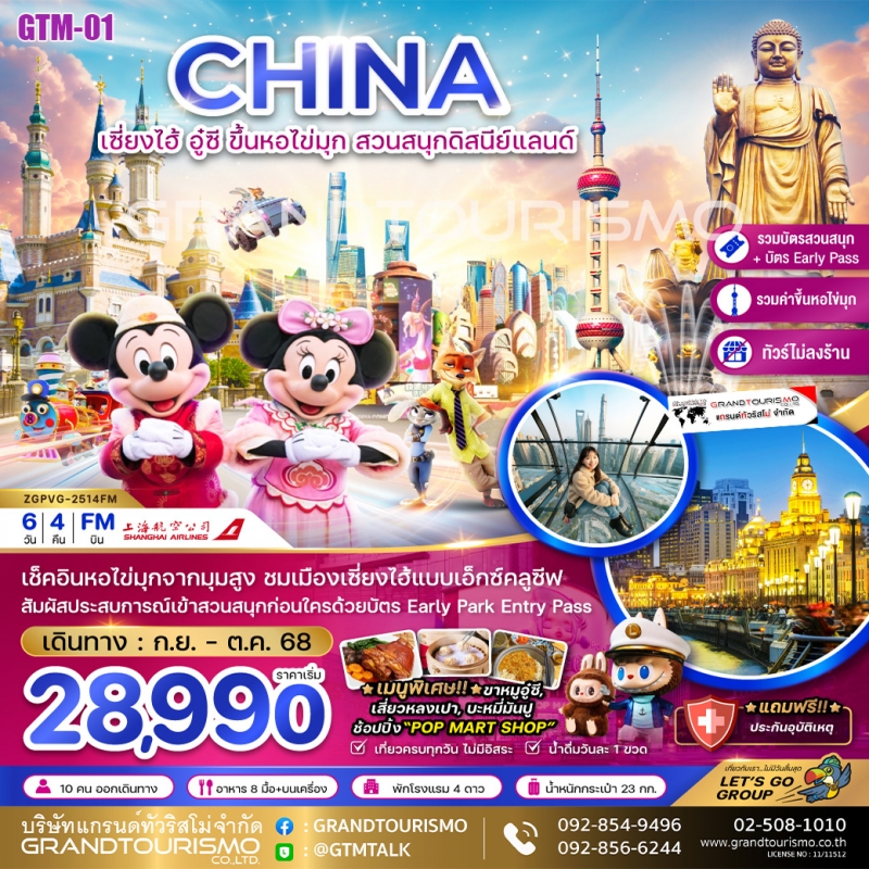 ทัวร์จีน เซี่ยงไฮ้ อู๋ซี ขึ้นหอไข่มุก สวนสนุกดิสนีย์แลนด์ (รวมขึ้นหอไข่มุก-รวมบัตรสวนสนุก-EARLY PASS)(ไม่ลงร้าน) 6วัน4คืน ก.ย.-ธ.ค.68