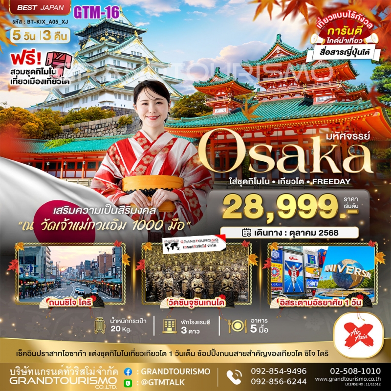 ทัวร์ญี่ปุ่น โอซาก้า เกียวโต ปราสาทโอซาก้า ถนนชิโจ ศาลเจ้าเฮอัน วัดซันจูซันเกนโด (อิสระ1วัน) 5วัน3คืน ต.ค.68