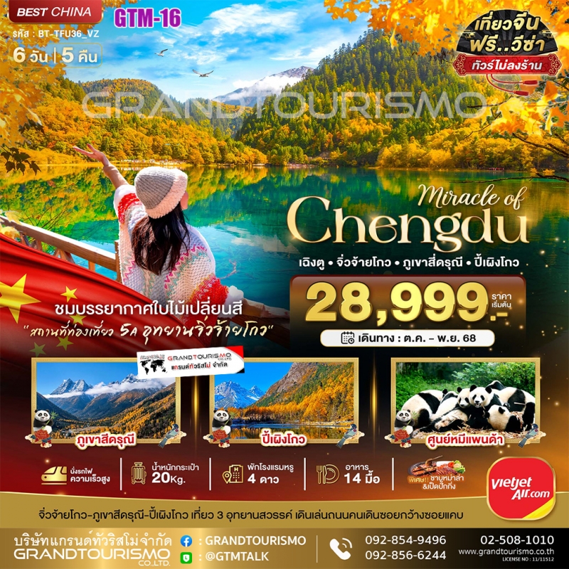 ทัวร์จีน เฉิงตู ภูเขาสี่ดรุณี ปี้เผิงโกว จิ่วจ้ายโกว นั่งรถไฟความเร็วสูง (ไม่ลงร้าน) 6วัน5คืน ต.ค.-พ.ย.68