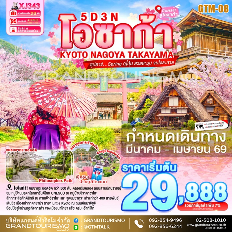 ทัวร์ญี่ปุ่น โอซาก้า ชิราคาวาโกะ นาโกย่า เกียวโต วัดกินคะคุจิ ศาลเจ้าฮิราโนะ ชินไซบาชิ 5วัน3คืน มี.ค.-เม.ย.69 BY XJ