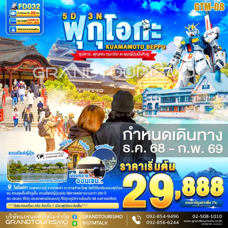ทัวร์ญี่ปุ่น ฟุกุโอกะ ยุฟุอิน เบปปุ คุมาโมโตะ ปราสาทคุมาโมโตะ หมู่บ้านยุฟุอินฟลอร์รัล (อิสระ1วัน) 5วัน3คืน ต.ค.-ธ.ค.68