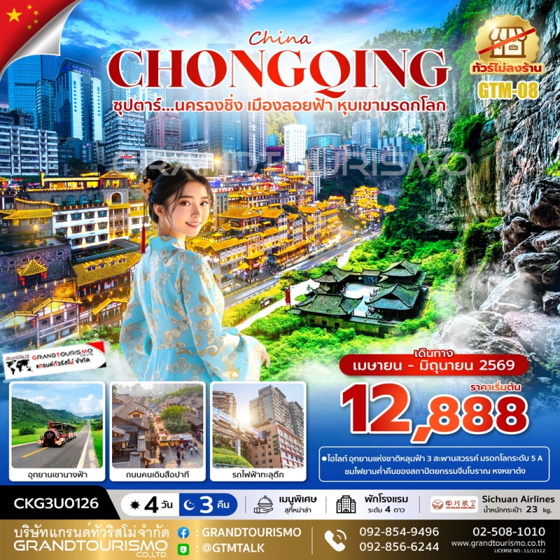 ทัวร์จีน ฉงชิ่ง (ไม่ลงร้าน)(อิสระ1วัน) อู่หลง อุทยานแห่งชาติหลุมฟ้า อุทยานเขานางฟ้า ถนนคนเดินสือปาที ตึก22ชั้น ตึกตะเกียบ 5วัน4คืน พ.ค.-มิ.ย.69 BY 3U